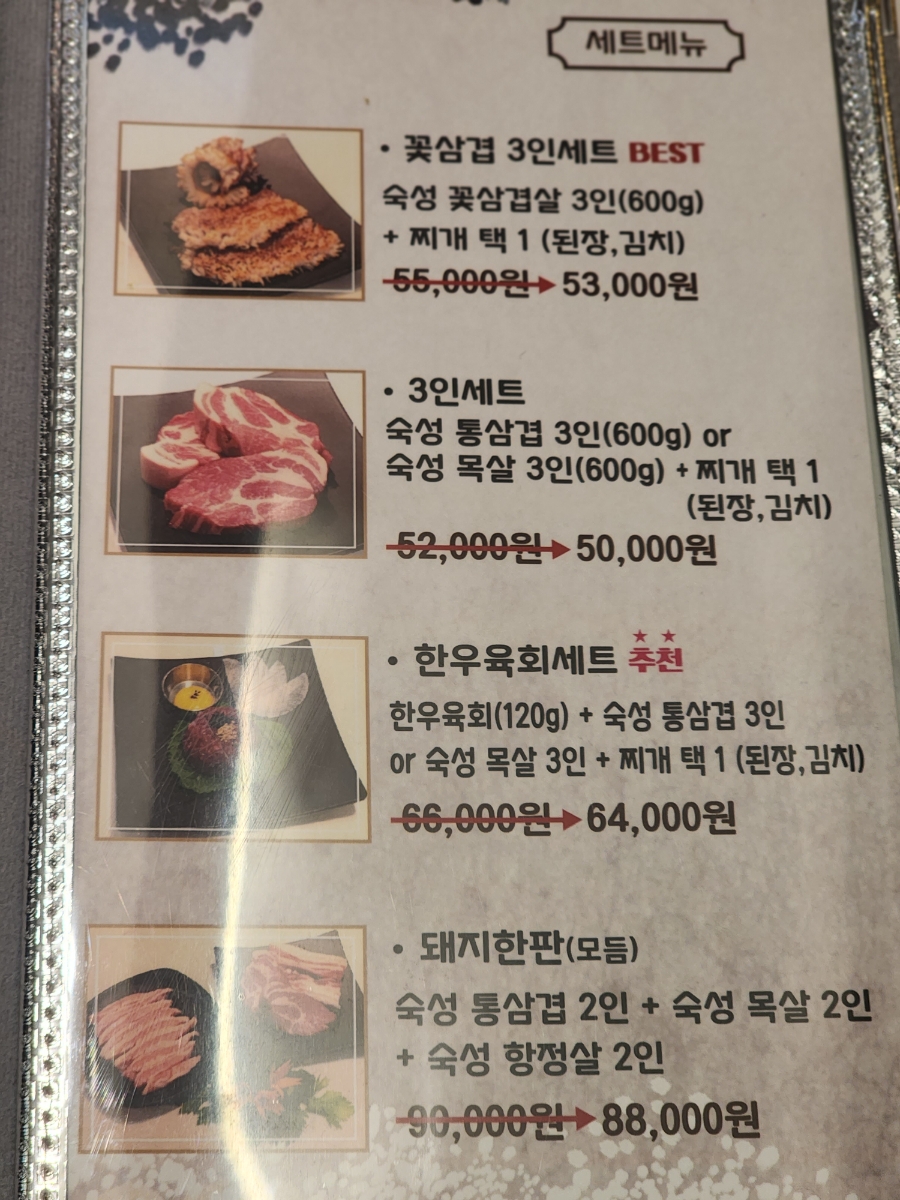 꽃삼겹 3인세트로 시켰어요~
